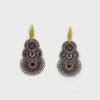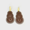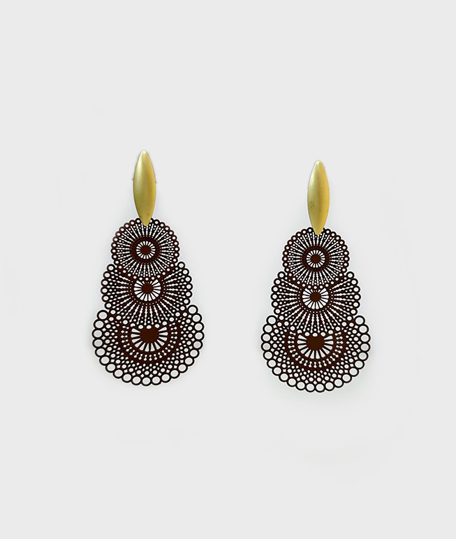 Brincos compridos elegantes em latão com banho de ouro, concebidos para realçar a feminilidade com um toque contemporâneo e sofisticado. Apresentam uma peça central composta por três discos rendados em tom castanho, criando um efeito visual leve, delicado e cheio de movimento. Comprimento aproximado 8 cm.