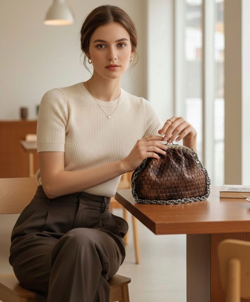 Para manter a tua bolsa sempre impecável, evita expô-la a humidade excessiva e limpa-a com um pano seco e macio. Por ser leve e discreta, fica bem tanto num outfit casual como num look mais sofisticado — experimenta-a com um casaco bege ou camelo para um contraste elegante.