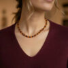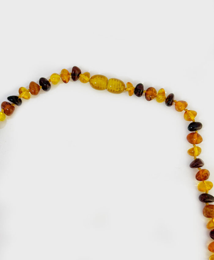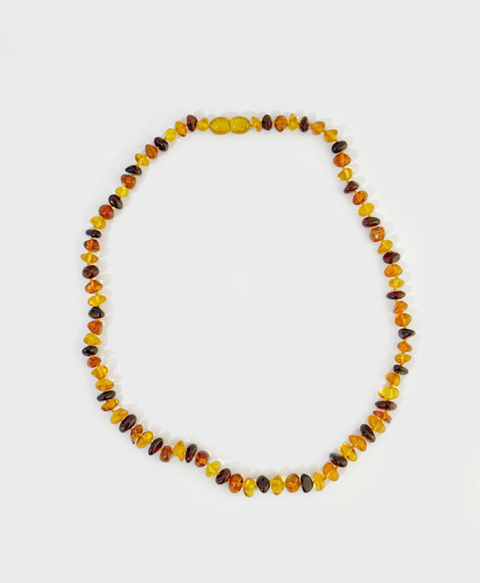 Este colar tricolor em âmbar natural é uma joia versátil e cheia de significado. Cada pedra de âmbar apresenta um tom distinto