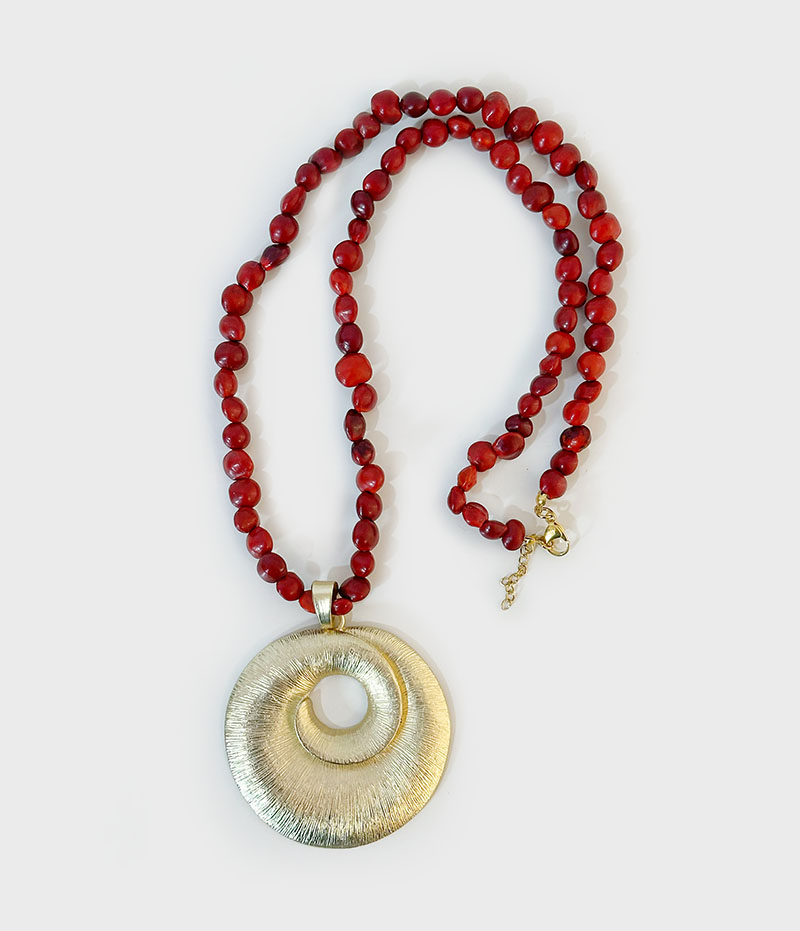 Um colar artesanal cuidadosamente confeccionado, que combina sementes vermelhas intensas com um medalhão em zamak dourado. O contraste entre o vermelho profundo e o brilho metálico torna este colar um acessório marcante, sofisticado e cheio de personalidade.