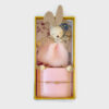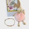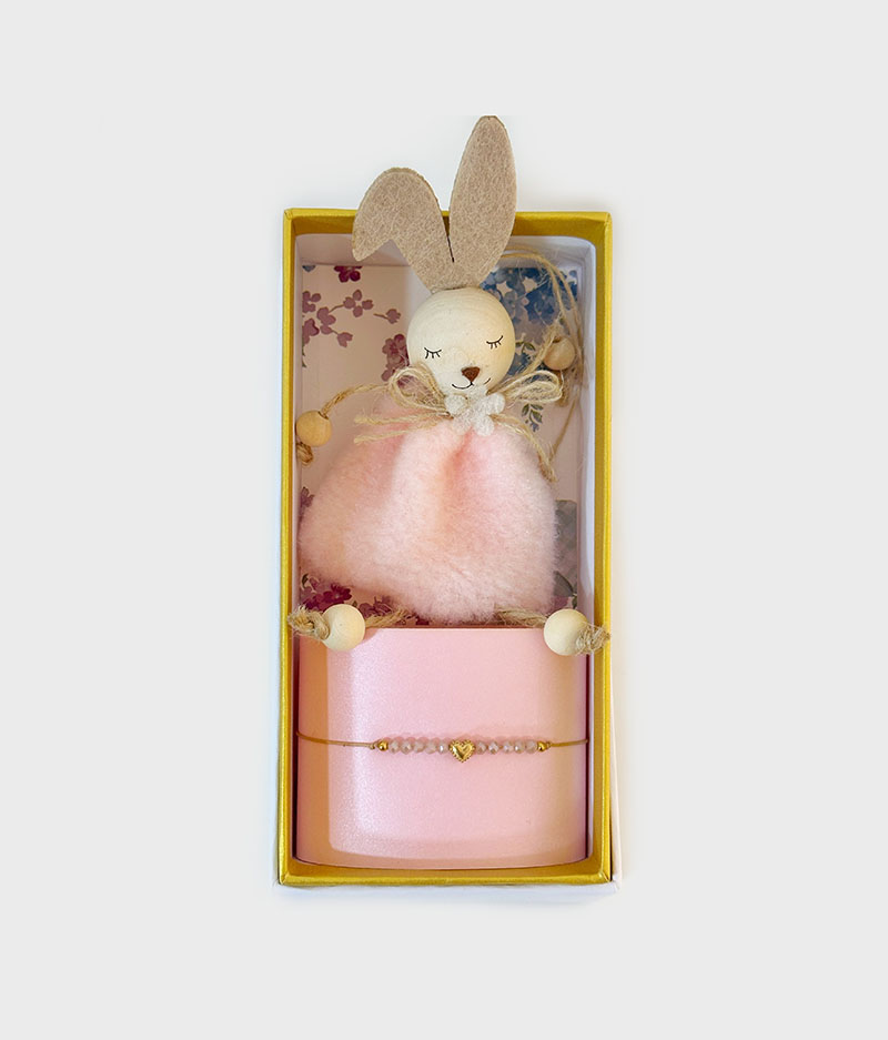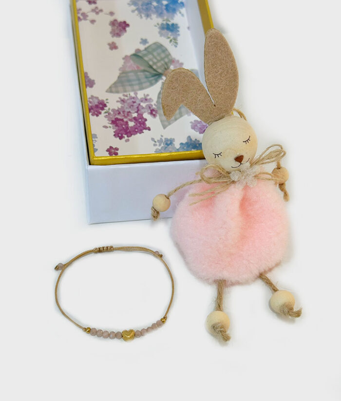 Conjunto composto peça decorativa em forma de coelho em tecido e pulseira de cristais