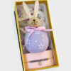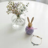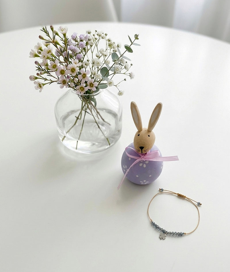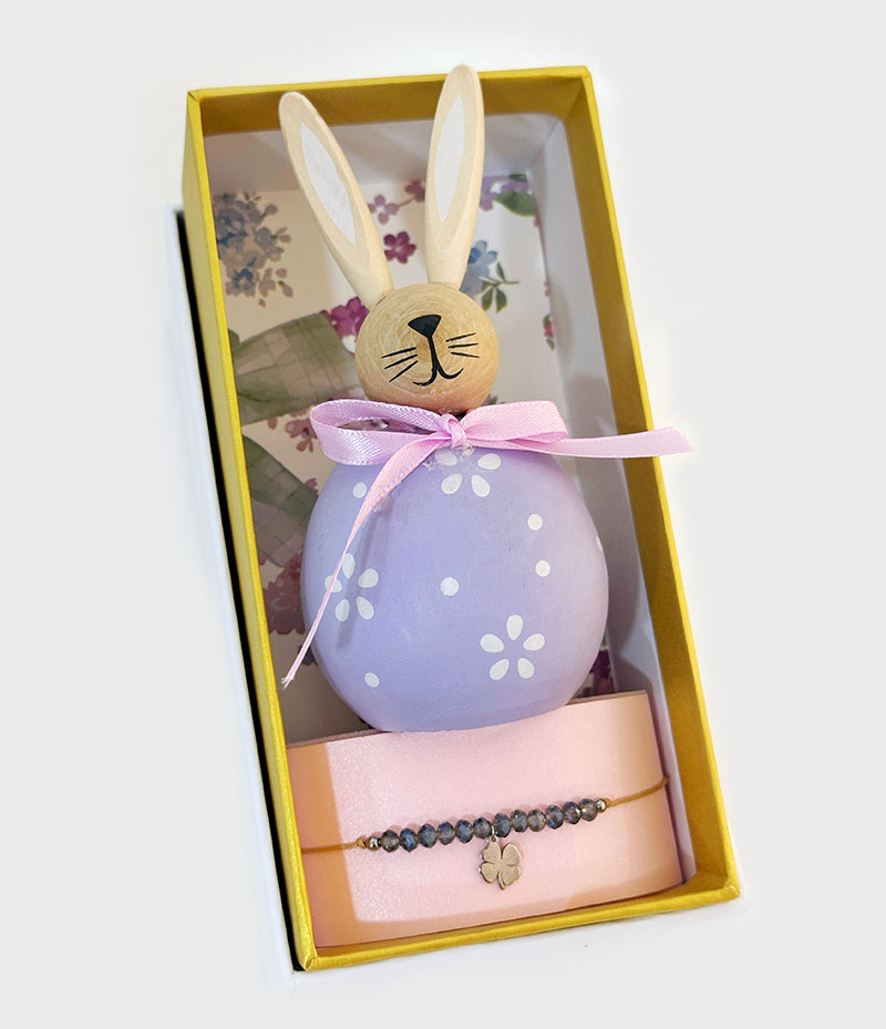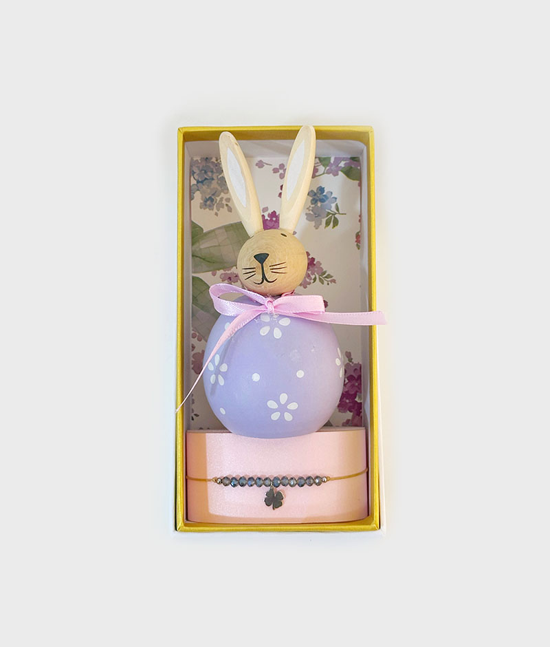 Conjunto composto peça decoratica em forma de coelho em madeira e pulseira de cristais