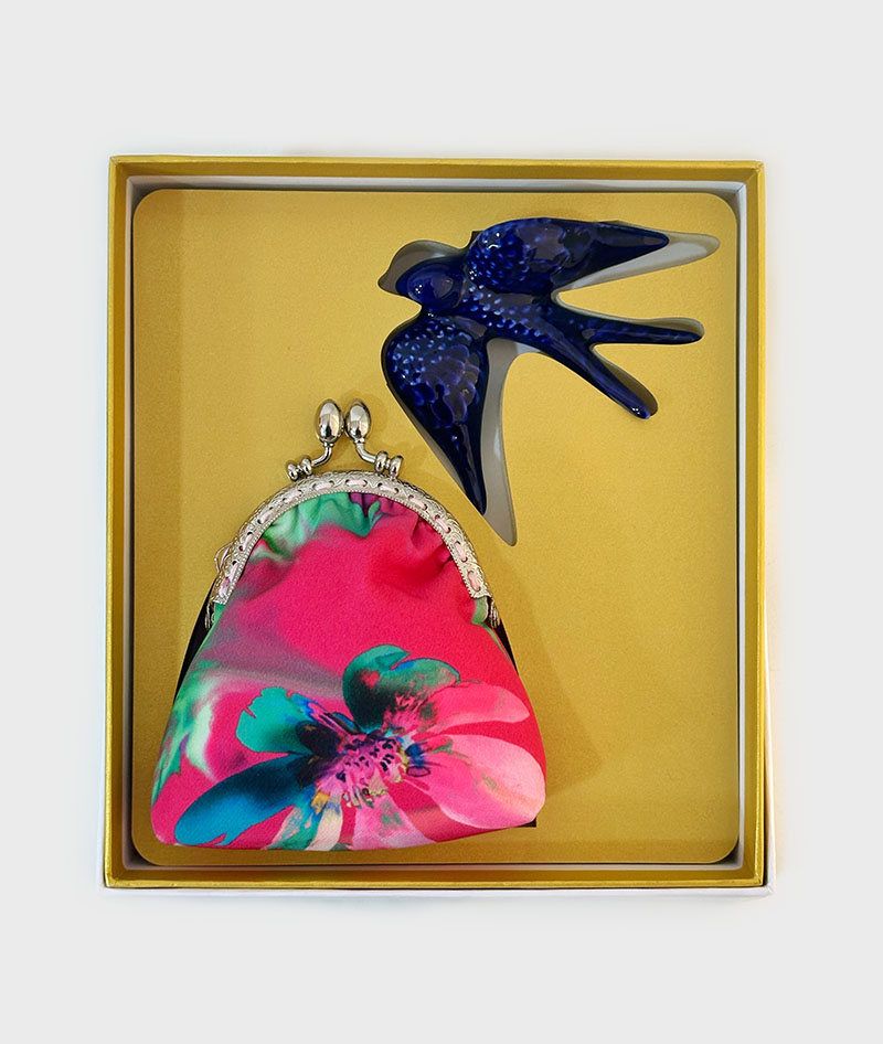 O porta-moedas é perfeito para o dia a dia, mantendo moedas e pequenos objetos organizados, enquanto a andorinha em cerâmica acrescenta charme a prateleiras, paredes ou mesas decorativas. Um conjunto versátil que se adapta tanto a casas modernas como a ambientes mais tradicionais.