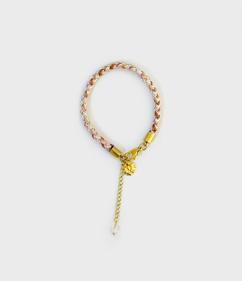 Pulseira com cordão de tons rosa e castanho com fecho em aço.