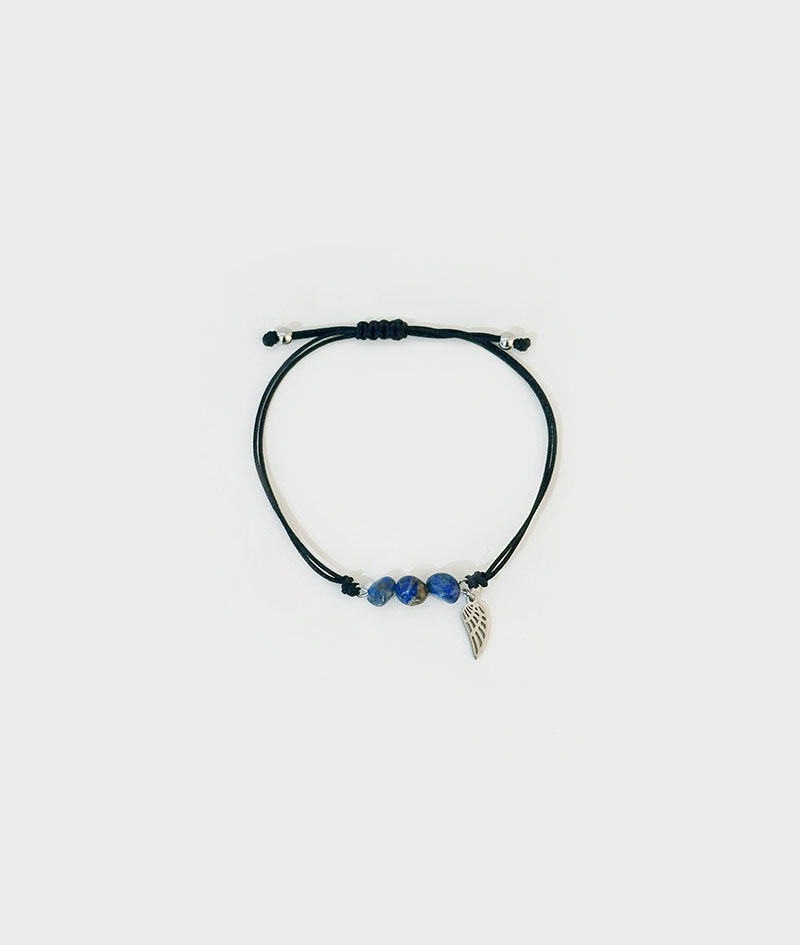 Pulseira ajustável com fio de algodão duplo, pedras lápiz-lazuli e pendente asa prateada em aço inoxidável.